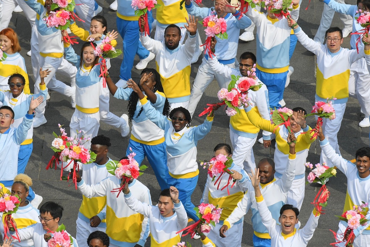 10月1日上午,庆祝中华人民共和国成立70周年大会在北京天安门广场隆重举行。这是“人类命运共同体”方阵。新华社记者 李尕 摄