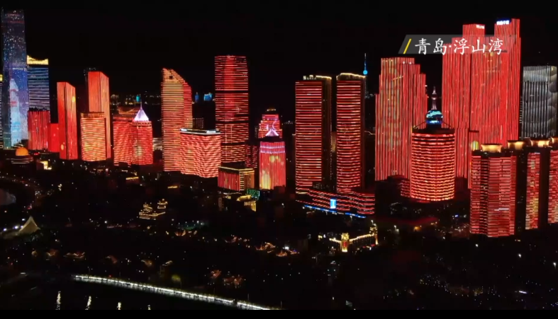 点击图片观看视频 五月的风点亮青岛辉煌路 隔海相望的五四广场上,青岛标志性雕塑“五月的风”已经被灯光点亮。星星之火,燎原海岸。中国共产党成立百年以来,熊熊火炬唤起了时代的觉醒,也照亮了青岛的辉煌之路。此时此刻,浮山湾248栋建筑物已经被点亮,庆祝中国共产党成立100周年主题灯光秀正在上演。 光影璀璨浮山湾 共庆建党百周年 几天之前刚刚启用的青岛新的地标性建筑——369米高的青岛海天中心,它的灯光布置面积达到了17万平方米。可以说,它的加入,完成了整个浮山湾畔灯光秀的最后一块拼图。