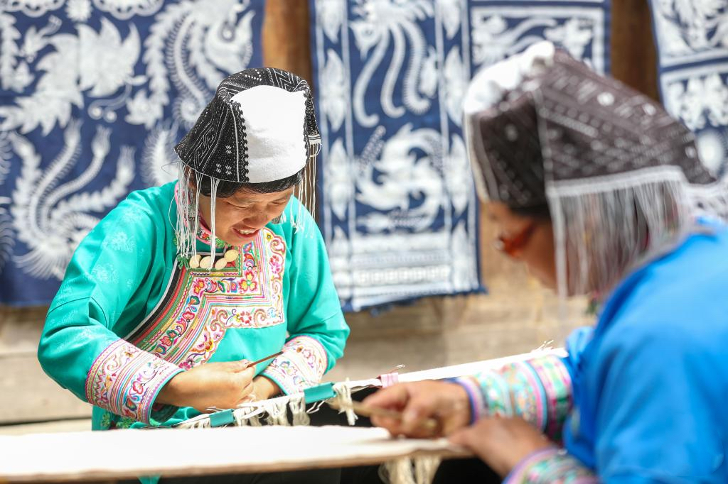 △贵州省榕江县塔石乡乌吉苗寨是黔东南州苗族蜡染刺绣非物质文化遗产生产性保护示范基地,图为当地村民在制作蜡画(2022年5月2日摄)。