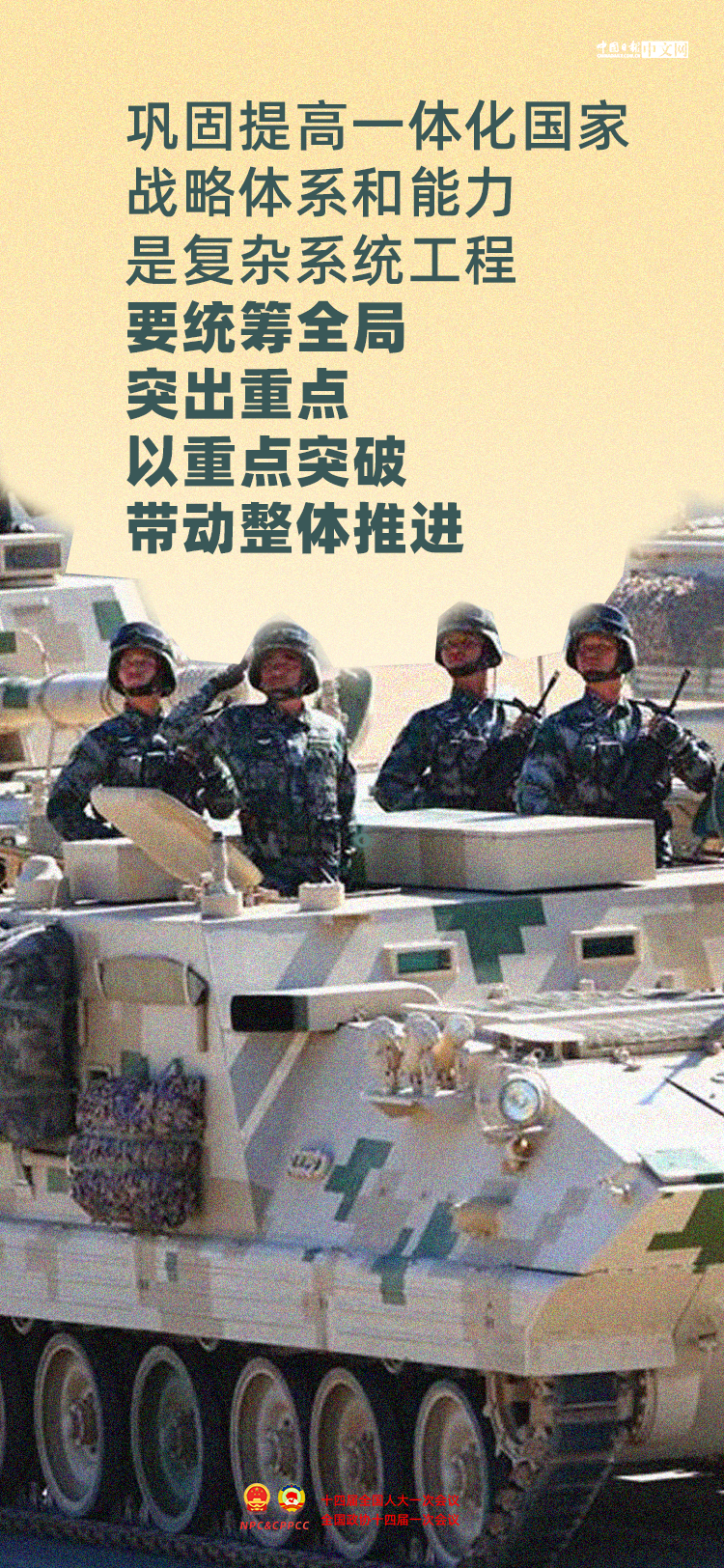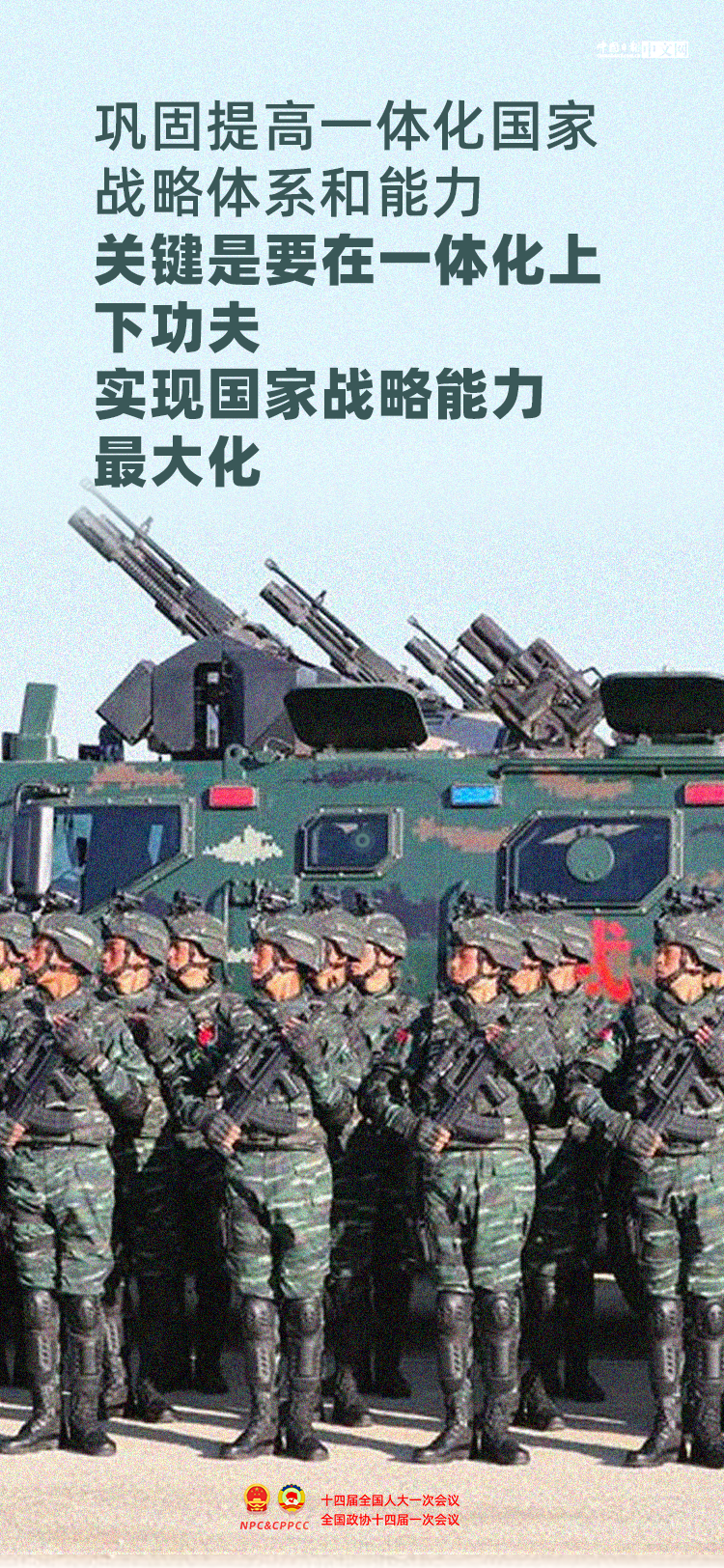中共中央总书记、国家主席、中央军委主席席大大8日下午出席十四届全国人大一次会议解放军和武警部队代表团全体会议。在6位代表发言后,席大大发表重要讲话,重点围绕巩固提高一体化国家战略体系和能力提出要求。巩固提高一体化国家战略体系和能力怎么做?一起来看。