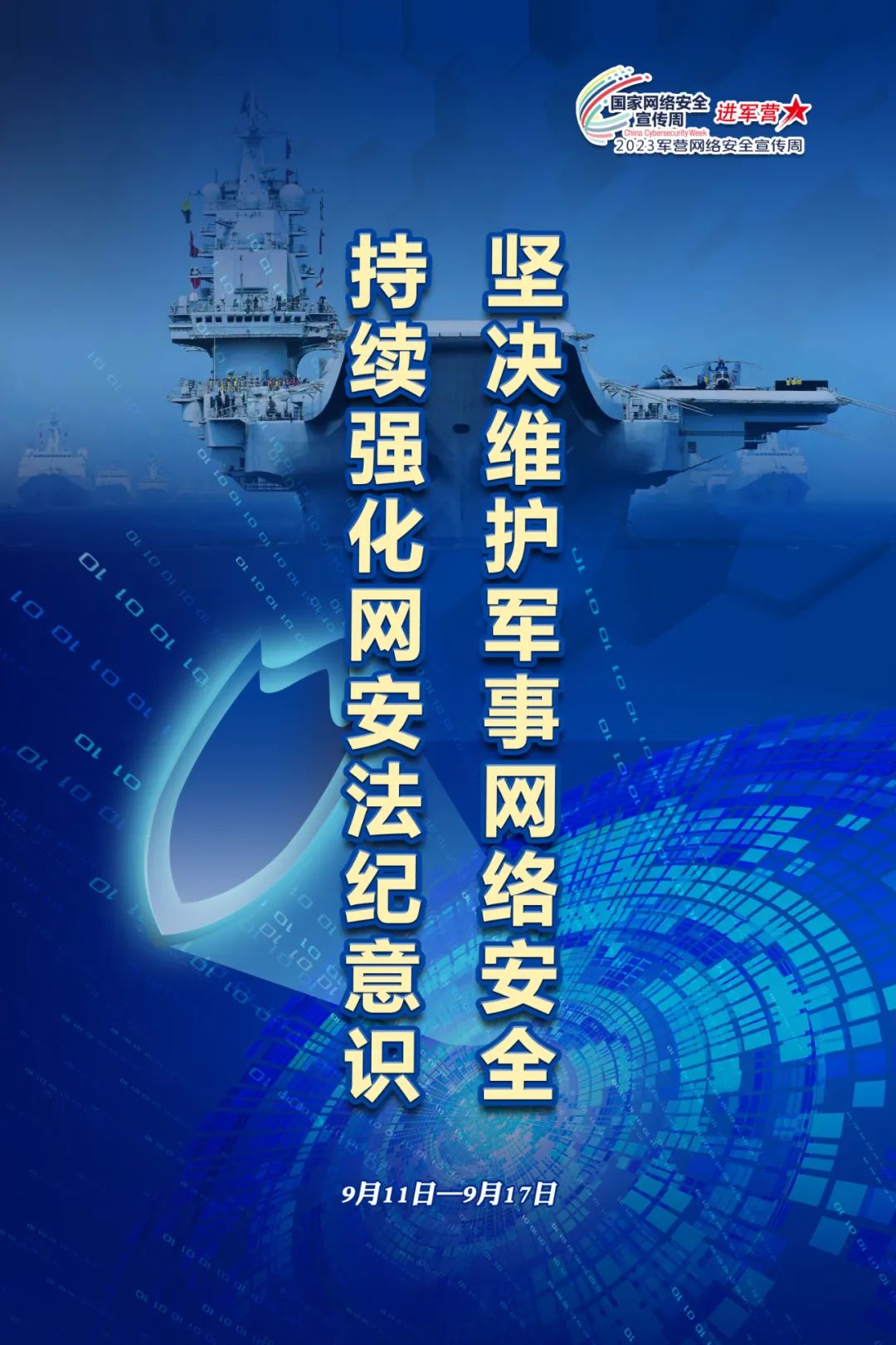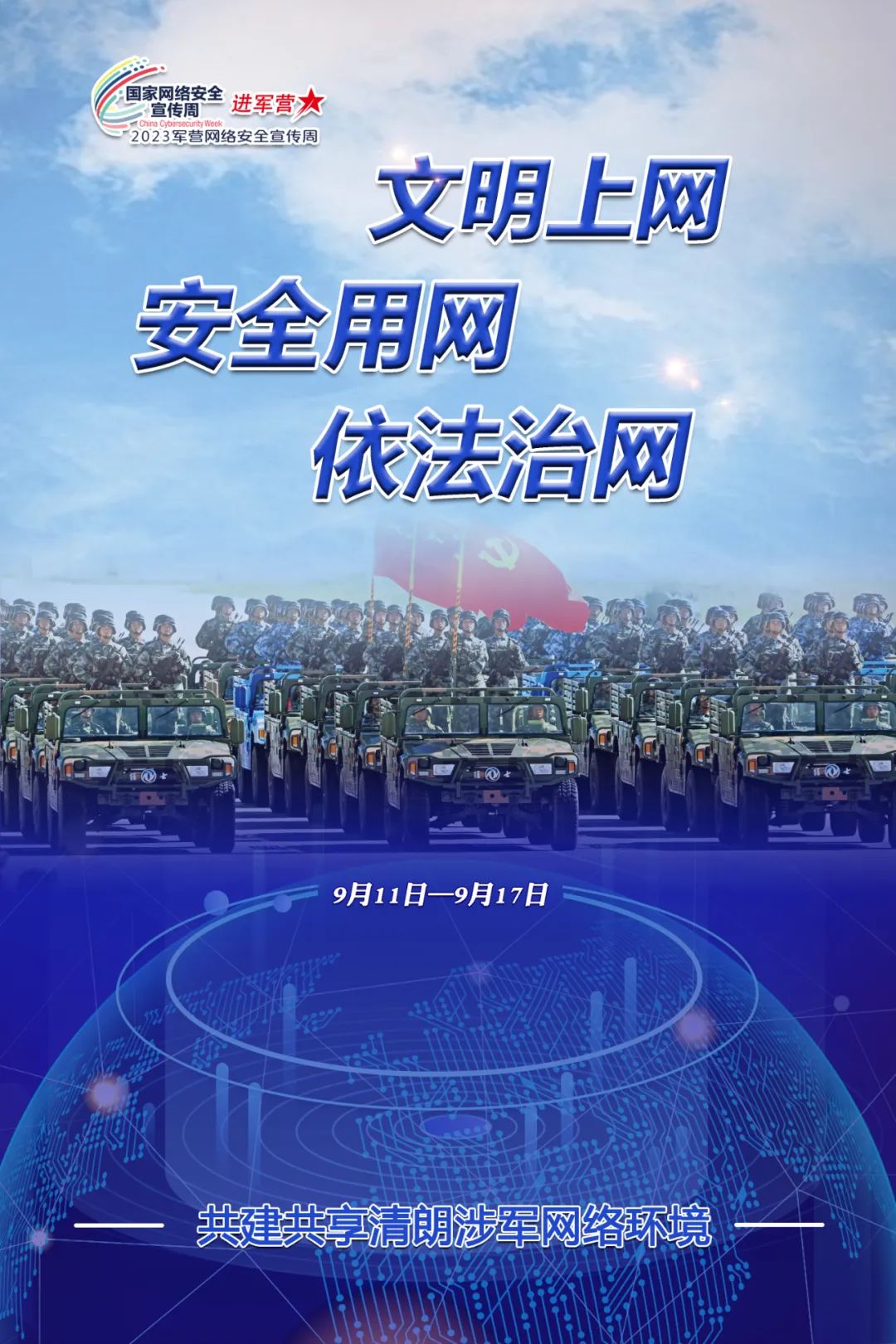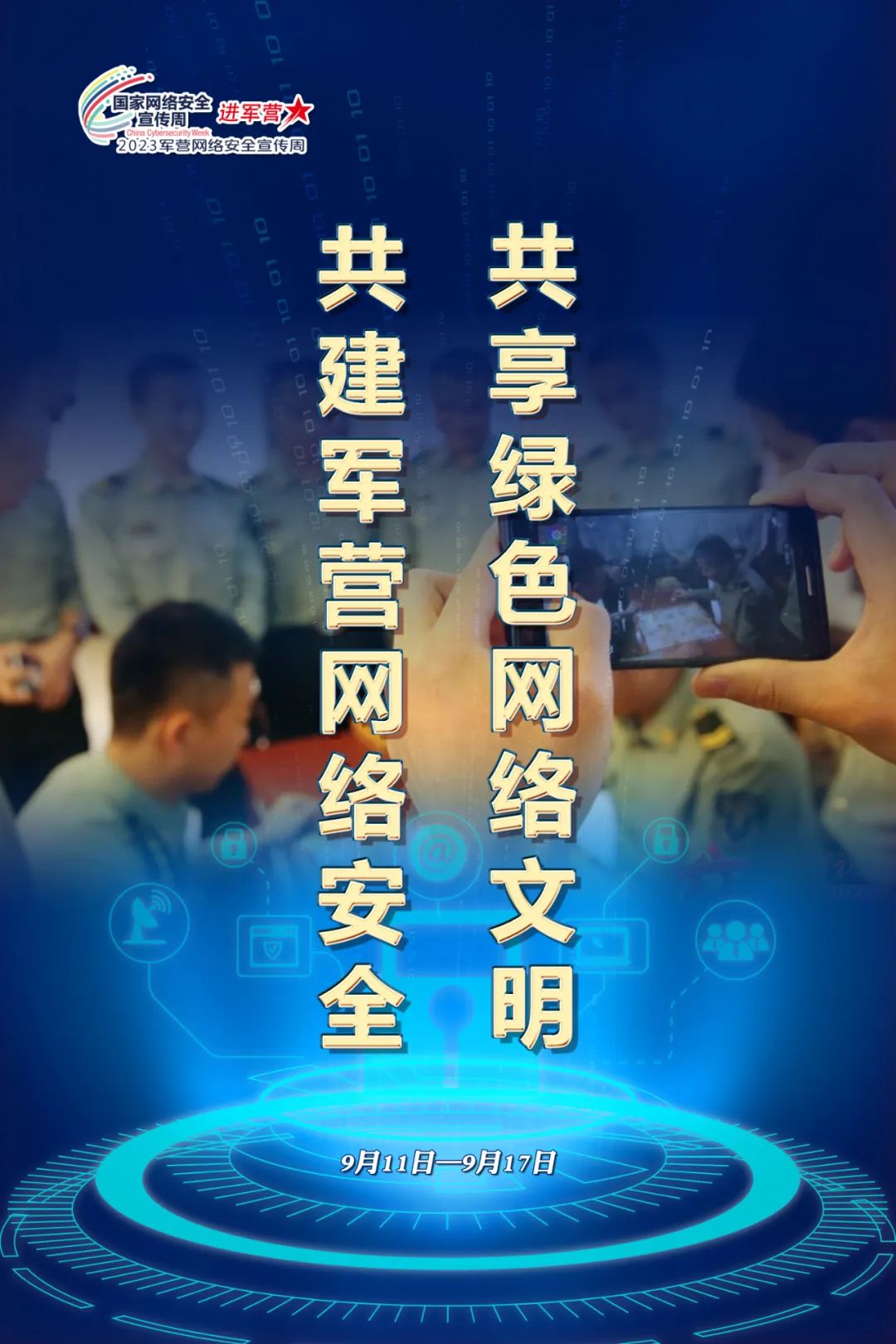 根据2023年国家网络安全宣传周活动部署,9月11日至17日,全军部队以“文明上网安全用网依法治网共建共享清朗涉军网络环境”为主题,结合网络安全进军营活动,深入开展2023年军营网络安全宣传周活动。