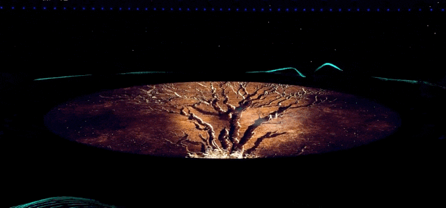 瞬间七 大莲花“复现钱塘江” 秋日是观潮的好时节 地屏上 交叉潮、一线潮、 回头潮、鱼鳞潮…… 此起彼伏 借助数字技术 钱塘江在“大莲花”复现