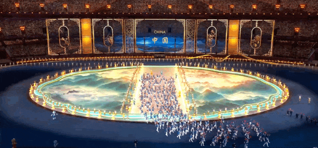 瞬间四 中国代表团入场 音乐秒换《歌唱祖国》 中国代表团入场时 屏幕上出现 唯美的江南山水图 大好风光辽阔浩荡 尽收眼底