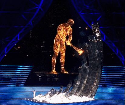 瞬间八 主火炬点火仪式太酷了 亚运会历史上 首个“数字人”参与的点火仪式 也是全世界首次“数实点火” 太酷炫了 横跨全场的立体网幕上 象征着超过1亿名“数字火炬手”的 金色数字人手持火炬, 跑过会场 与真实的主火炬手一起 点燃了名为“潮涌”的主火炬塔