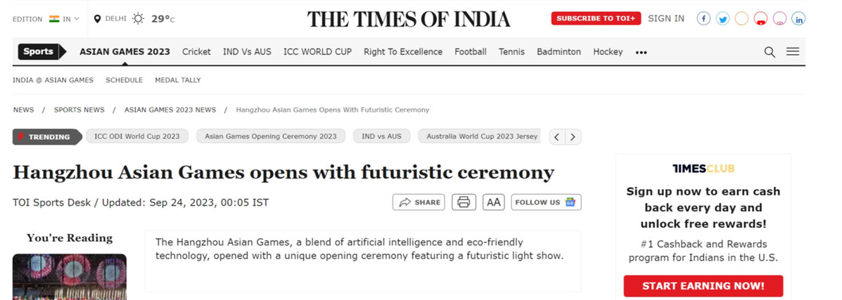中国日报网9月24日电 9月23日晚8点,杭州第19届亚运会开幕式在杭州奥体中心体育场举行。钱塘江畔,“潮起亚细亚”,一场无与伦比的运动盛会正式拉开序幕。 开幕式后,外媒对数字人点燃主火炬和电子烟花印象深刻,认为亚运会开幕式既展示了中国传统文化,也充满未来感。