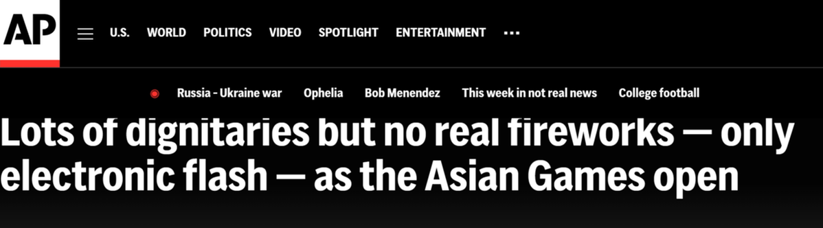 美联社报道称,烟花是体育赛事开幕式或闭幕式的常规特色,但于9月23日举行的杭州亚运会开幕式不以传统烟花表演为特色。 本届亚运会开幕式并没有使用真正的烟花。相反,使用“绿色”高科技,用三维动画、AR等数字科技让观众感受到同样热烈的烟花表演。