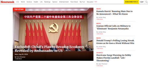 2024年8月2日,驻美国大使谢锋接受美国《新闻周刊》(Newsweek)高级外交政策记者汤姆·奥康纳专访,阐释中国共产党二十届三中全会精神。访谈内容8月5日在该周刊网站头版头条刊登。主要内容如下: