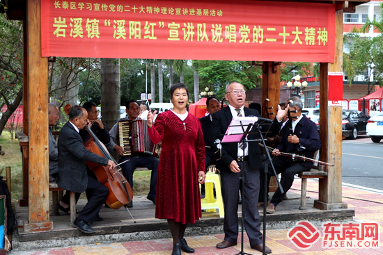 “共产党为人民,得民心,二十大描绘美好的前程……”长泰区珪后村乡村公园里,一支由村里老人组成的“溪阳红”宣讲队格外引人注目,他们把党的二十大报告金句串联起来,用闽南方言以说唱的形式向村里群众宣讲,浓浓的乡音格外接地气,围观群众纷纷叫好。 党的二十大闭幕后,漳州市长泰区迅速从各地各单位抽调骨干,成立11支理论宣讲小分队。11月2日上午,长泰区在岩溪镇珪后村启动“学习宣传党的二十大精神理论宣讲进基层活动”,区委常委、宣传部部长陈贵芬向全区9个乡镇(场、区、办事处)、区直机关党工委、教育局组成的宣讲小分队授旗。区委党校教师作了题为《团结奋发绘宏图 百年圆梦谱新篇——深入学习贯彻中国共产党第二十次全国代表大会精神》专题辅导报告。
