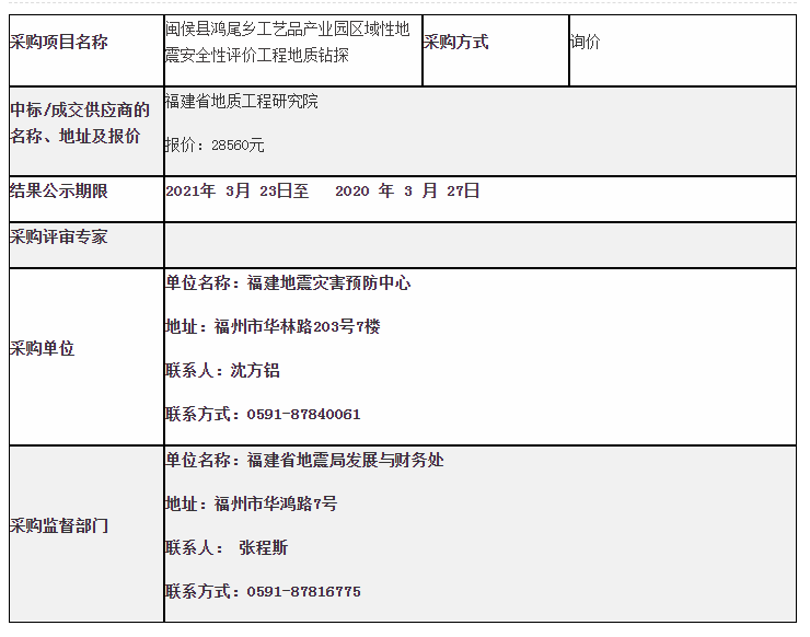 福建地震灾害预防中心2021年闽侯县鸿尾乡工艺品产业园区域性地震安全性评价工程地质钻探采购结果公示
