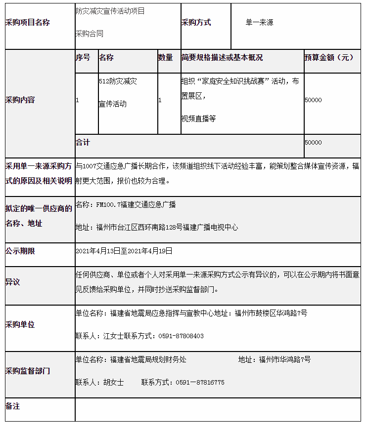 应急指挥与宣教中心防灾减灾宣传活动项目单一来源采购公示