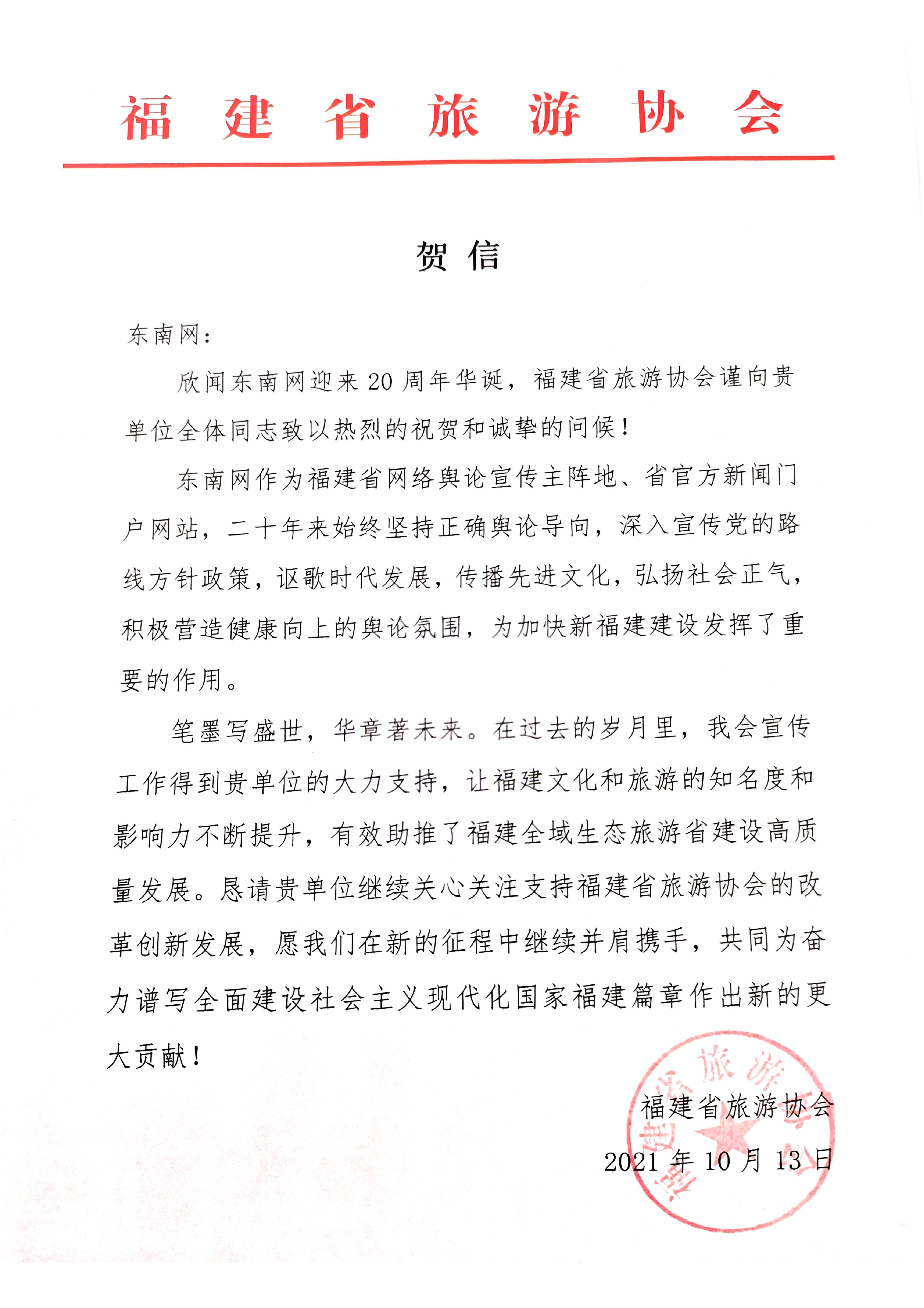 福建省旅游协会贺信