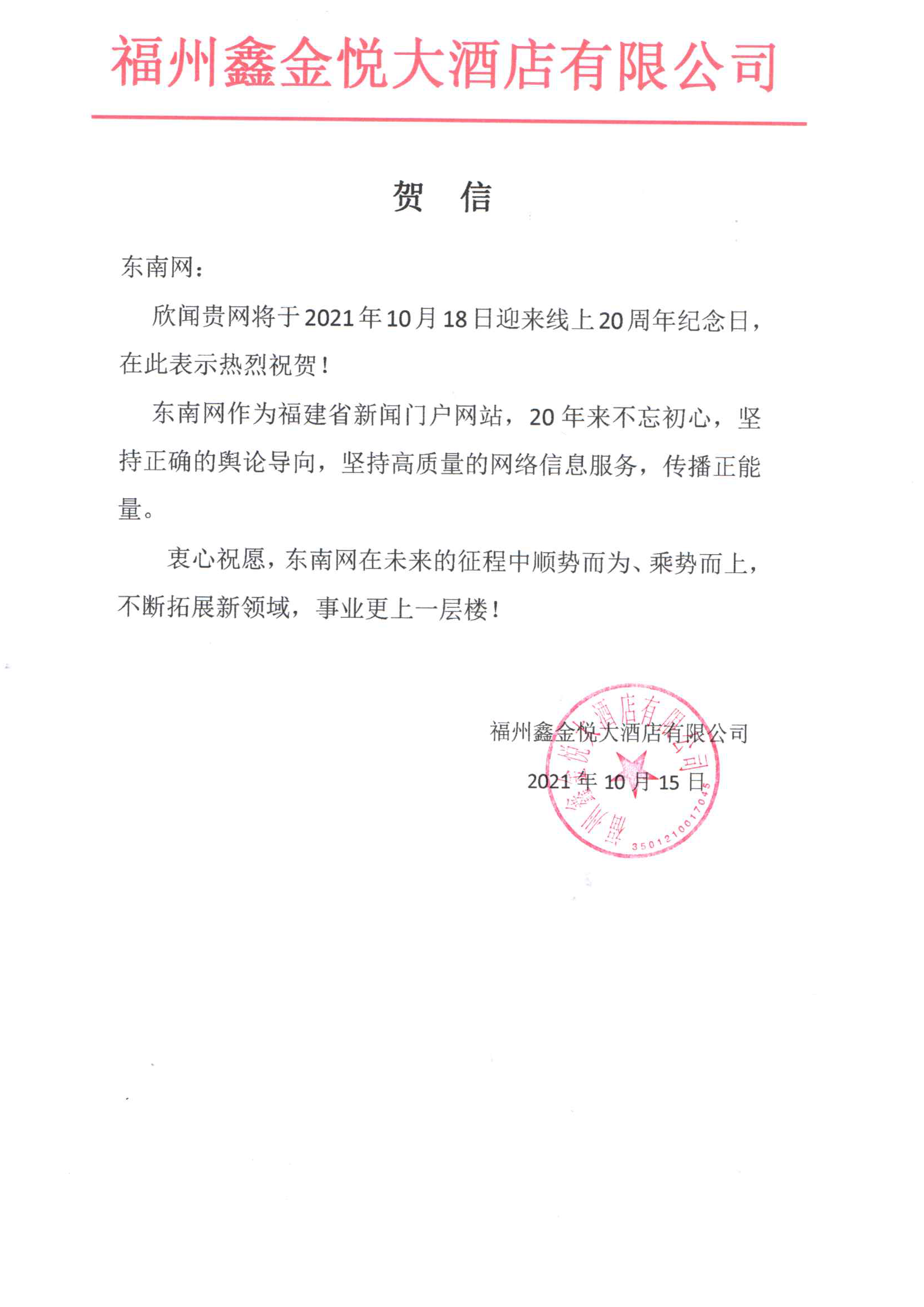 凯发k8鑫金悦大酒店有限公司贺信