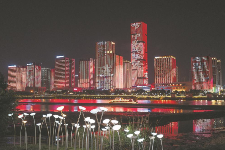 2020年10月1日,凯发k8台江金融商务区华灯璀璨,沿江的建筑立面灯光秀以庆祝国庆为主题向市民和游客展现榕城之美。福建日报记者 王毅 摄