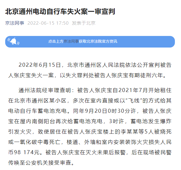 6月15日,北京市通州区人民法院依法公开宣判被告人张庆宝失火一案,以失火罪判处被告人张庆宝有期徒刑六年。 通州法院经审理查明:被告人张庆宝自2021年7月开始租住在北京市通州区某小区,多次在室内直接或以“飞线”的方式给其电动自行车蓄电池充电。同年9月20日0时30分许,被告人张庆宝在屋内南侧阳台再次给蓄电池充电,3时许,蓄电池发生爆炸引发火灾,致使居住在被告人张庆宝楼上的李某某等5人被烧死或一氧化碳中毒死亡,楼道、外墙和室内安装装饰火灾损失人民币98174元。被告人张庆宝在灭火未果后报警,后在现场被民警传唤至公安机关接受审查。 通州法院认为,被告人张庆宝在日常工作生活中安全意识淡薄,无视相关管理规定,在室内为电动自行车蓄电池充电,未尽到安全注意义务,引发重大火灾,造成五人死亡,严重危害公共安全,其行为构成失火罪,依法应予惩处。被告人张庆宝犯罪行为所造成的严重危害后果及其犯罪后具有自首、认罪认罚等情节,在量刑时予以综合考虑。根据被告人张庆宝犯罪的事实、性质、情节及对于社会的危害程度等,遂作出上述判决。