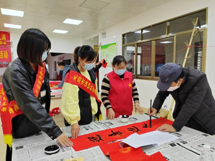 “玉兔迎新携春来,义写挥春福气满”——迎新春赠春联活动 赠春联迎新春 1月10日下午,新罗区北城街道闽西交易城社区党委、居委会联合闽西交易城业委会、共建单位市供销社、新罗国资集团、龙岩农商银行北城支行在社区综合文化服务中心开展“玉兔迎新携春来,义写挥春福气满”——迎新春赠春联活动。 活动现场,暖意融融、翰墨飘香,书法志愿者和辖区半墨书法林炜老师挥毫泼墨,红纸黑字,一横一竖,一撇一捺,把祝福融入到春联之中, 一幅幅带着浓浓墨香的春联福字,在渲染出浓浓年味的同时,也寄托了人们对新春的祝福和对幸福生活的憧憬。 期间,社区金融助理、新时代文明实践站志愿者、蒲公英志愿者们向辖区居民发放宣传手册,宣传移风易俗、禁毒反诈、防范非法集资、防范电信诈骗、消防安全、法治等知识,并送上精美的法治年画和红色礼包,现场气氛热闹非凡,红艳艳的春联和居民灿烂的笑容为即将到来的新年增添了喜庆的节日气氛。