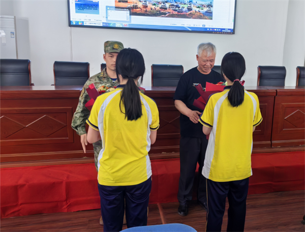 宣讲活动中,惠华中学学生代表向授课官兵及老兵宣讲员献花。
