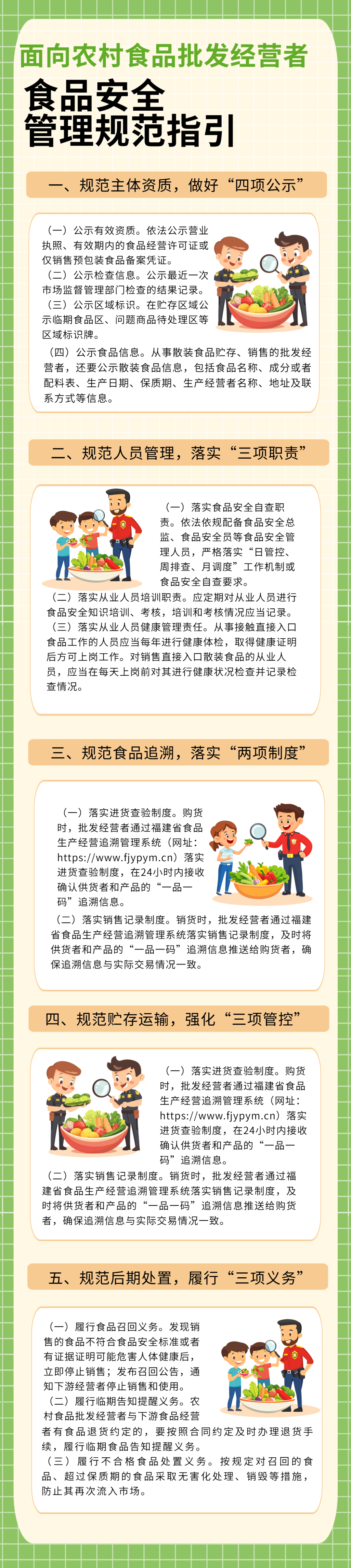 为了让大家吃得安心、买得放心,省市场监管局瞄准农村食品流通的关键环节,带来了超实用的“四个一”监管“组合拳”,全方位给农村食品批发提个醒、加把劲,一起筑牢农村食品安全“防护网”! 开展一次摸底排查 建立健全监管台账 充分运用食品安全“一品一码”追溯系统并结合日常监督检查、专项检查等工作开展摸底排查,以米、面、油、肉、蛋、奶等大宗食品和方便食品、休闲食品、酒水饮料为重点,摸清辖区内乡镇、村、城乡接合部的食杂店、小超市等食品经营者的上游食品进货来源,对批量向农村地区或城乡接合部食品经营单位销售食品的批发经营者建立面向农村食品批发经营者台账。2025年底前,在“福建省市场监管智慧一体化平台”上标注“面向农村食品批发经营者”电子标签,并实行动态管理。 落实一次辅导培训 督促落实主体责任 通过集中培训或走访辅导等形式,针对农村食品批发经营者每年至少开展一次培训辅导,督促指导其落实食品安全主体责任,建立食品安全风险管控清单,落实“日管控、周排查、月调度”制度,做到主体资质合法有效、亮证经营,经营场所布局合理、整洁卫生,经营过程可控、管理规范,定期开展食品安全自查,及时排查消除食品安全风险隐患。同时,要督促农村食品批发经营者严格履行食品安全“一品一码”信息追溯责任,及时在福建省食品安全“一品一码”信息追溯平台注册并按要求录入相关追溯信息,确保来源可查、去向可溯。省市场监管局组织制定了《面向农村食品批发经营者食品安全管理规范指引》(后附一图读懂),供各地参考。 组织一次隐患排查 加大监管执法力度 将农村食品批发经营者作为重点监管对象,在遵循市场监管协同检查改革要求的基础上,开展一次农村食品批发经营者食品安全风险隐患排查。重点检查其经营资质、进货查验、销售记录、温湿度控制、“一品一码”信息追溯、假冒伪劣食品处置以及食品安全自查制度落实情况。对受到行政处罚、 一年内检出3批次及以上不合格食品或销售假冒伪劣食品的农村食品批发经营者开展约谈,加强行政指导。要用好暗访突查和抽检监测等手段,严厉查处“三无”食品、劣质食品、过期食品,以及食品中添加(或浸泡)非食用物质、超范围超限量使用食品添加剂和宣传特殊功能的普通食品等违法违规行为。近期要重点关注排查甲醛浸泡牛羊杂、双氧水漂白鸡爪和牛羊肚,即食水果添加甜味剂、防腐剂等违法违规行为。涉嫌犯罪的,依法移送公安机关。 倡导一次提示帮促 推动行业规范提升 倡导推动农村食品批发经营者结合日常经营活动,积极开展食品安全提醒提示和帮促辅导活动。鼓励农村食品批发经营者在加强自身食品安全管理人员、业务员、送货员食品安全培训的基础上,利用洽谈业务、食品配送等时机,对农村食品销售者开展一次食品安全管理简易辅导,帮助其排查清理一次过期和不符合食品安全要求食品,履行一次临期食品告知提醒义务,通过加强同行互助帮促,帮助农村食品销售者增强食品安全意识,推动行业食品水平持续提升。