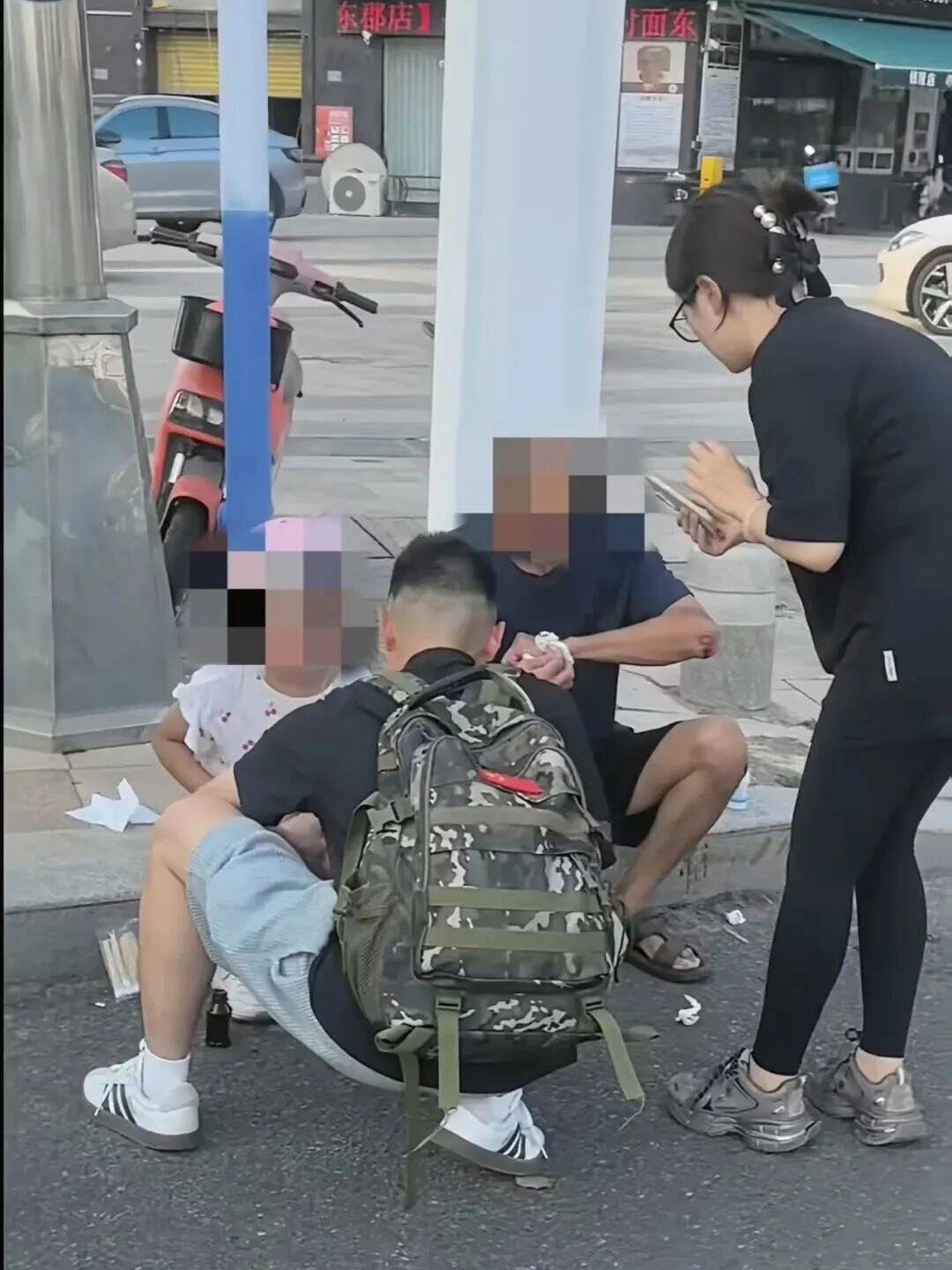 2025年10月17日下午,在漳浦县金浦大道与文昌路交叉口,一辆电动车与轿车相撞,骑车的老人和孙女倒地受伤。老人手臂血流不止,膝盖、肩部多处受伤,小女孩受惊哭泣。正好路过的杨泽毅立即上前,单膝跪地查看伤势,并运用在部队学到的急救技能,为老人消毒、止血、包扎,同时温柔安抚小女孩。他还协助将祖孙二人移至路边安全处,待事故车辆女司机将伤者送医后,又默默把电动车移至停车区,清理完路面血迹后才悄然离开。