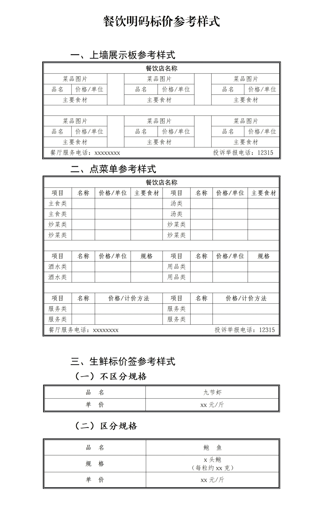 根据《中华人民共和国价格法》《明码标价和禁止价格欺诈规定》《中华人民共和国消费者权益保护法》《餐饮业促进和经营管理办法》等法律法规和国家有关规定梳理形成本指引,供各餐饮经营者参考使用。 餐饮收费“十标清”指引 一、收费标准要标清。 餐饮经营者应通过价目表、点菜单、展示板或点菜小程序等方式,清晰完整地公示所有盘菜、套餐、主食等菜品和酒水、纸巾等商品用品以及加工、打包、外送等服务的收费单价和计价单位。 二、主要食材要标清。 餐饮经营者应在经营场所醒目位置,对各式菜品的主要食材予以明确标示。如“砂锅牛腩(主要食材:牛腩、萝卜)”。 三、时令菜价要标清。 餐饮经营者应当及时更新时令菜品价格信息,并在大厅、点菜区等显著位置通过价目表、电子屏等方式公示海鲜、蔬菜、瓜果等时令菜品的最新价格。 四、食材属性要标清。 对价格较高或容易引发争议的特殊食材,餐饮经营者应当特别备注其产地、养殖方式、品级等属性。如标注“甲鱼(野生)”“大闸蟹(产地:阳澄湖)”。 五、加工费用要标清。 如需对生鲜菜品加收烹饪加工费的,餐饮经营者应分别标明生鲜食材价格和加工费用。如“小青龙XX元/斤,避风塘风味加工费XX元/份”。 六、额外费用要标清。 在菜金之外,如需加收服务费、茶水费以及一次性消毒餐具、纸巾等费用的,餐饮经营者应在价目表、点菜单等醒目位置逐一标明收费标准,并在消费者点餐时主动告知。 七、套餐内容要标清。 提供年夜饭、旅游团餐等套餐的,餐饮经营者应标明套餐价格,并逐一列明套餐所含的菜品、商品、用品的名称、份量、适用人数及相关服务内容,同时标明是否加收服务费、茶水费等其他收费。 八、外卖价格要标清。 通过网络平台提供外卖服务的,餐饮经营者应在平台页面清晰公示菜品、饮品、商品、用品的价格、份量,以及打包、配送等服务收费标准。 九、价格优惠要标清。 开展降价、打折、团购套餐等促销活动时,餐饮经营者应在经营场所或网络平台醒目位置标明优惠菜品、优惠价格、优惠期限、优惠条件、使用限制等详细信息。 十、服务热线要标清。 餐饮经营者应当在经营场所显著位置标明服务电话和投诉举报渠道,方便顾客及时反映价格、服务等相关诉求。 餐饮收费“十不得”指引 一、不得使用品名、价格、计价单位标示不清的价目表、点菜单,或使用“时价”“面议”等模糊表述规避明码标价义务。 二、不得在公示的菜品和酒水等商品价格及服务收费标价之外,加价收取菜金、出售商品或者提供服务。 三、不得收取任何未予标明的服务费、茶水费、厨余垃圾处理费以及一次性消毒餐具、纸巾等各类费用。 四、不得通过不标示、模糊标示或以细小字体、隐蔽位置等显著弱化方式,标示对消费者不利的价格条件。 五、不得使用具有欺骗性、误导性的菜品图片、视频等媒介标示价格相关信息,诱骗消费者进行消费。 六、不得采取“阴阳菜单”“两套价格”“低标高结”等不正当价格手段欺诈消费者。 七、不得设定任何形式的最低消费金额,包括通过包间费、指定套餐等变相方式设定最低消费。 八、不得在消费者核销团购优惠券等凭证时,临时增设使用条件或限制使用范围,变相提高消费价格。 九、不得在未经消费者同意的情况下,擅自降低已承诺提供的菜品质量或服务标准。 十、不得在节假日、旅游旺季等重要时段,利用市场供需紧张状况,坐地起价、跟风涨价、哄抬价格,扰乱市场秩序。